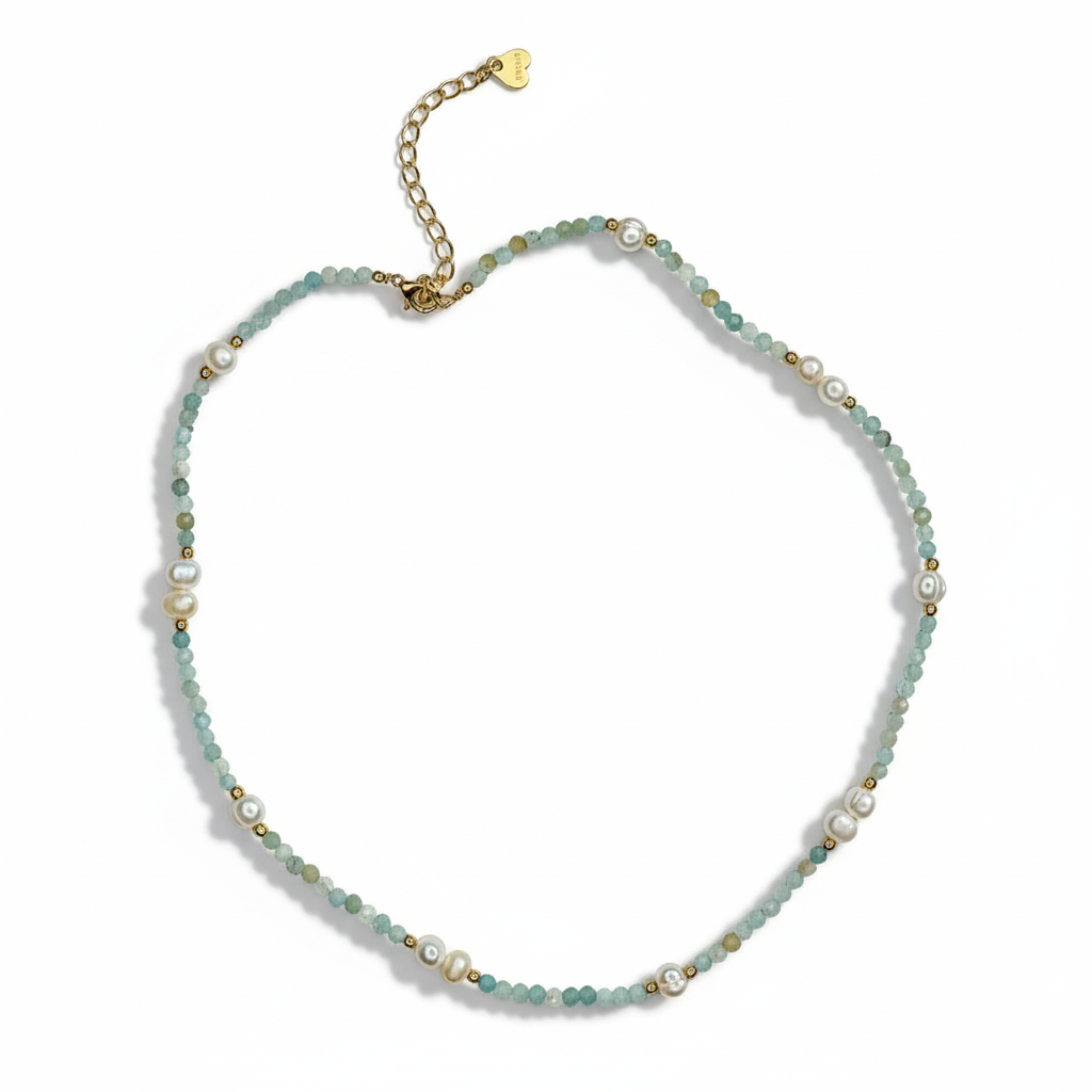 Ez az elegáns nyaklánc természetes barokk gyöngyöket finom féldrágakövekkel, például akvamarinnal és valószínűleg amazonittal vagy acháttal kombinál, visszafogott pasztell árnyalatokban. Az áttetsző hegyikristály gyöngyök fényt és ragyogást kölcsönöznek, míg az apró arany részletek fokozzák az ékszer luxus megjelenését. Az eredmény egy harmonikus és kifinomult dísz, amely mindennapi viseletre és különleges alkalmakra egyaránt alkalmas.