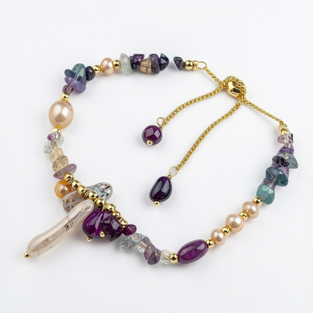 Ez a gyönyörű karkötő édesvízi gyöngyök, élénk ametisztkövek és színes fluorit akcentusok harmonikus keverékét tartalmazza, finom arany részletekkel kiegészítve. Az anyagok és színek egyedi kombinációja magával ragadó és elegáns dizájnt hoz létre. Ez a karkötő ideális arra, hogy egy csipetnyi természetes szépséget kölcsönözzön bármilyen öltözéknek, és különleges alkalmakra, valamint kifinomult mindennapi viseletre egyaránt alkalmas.