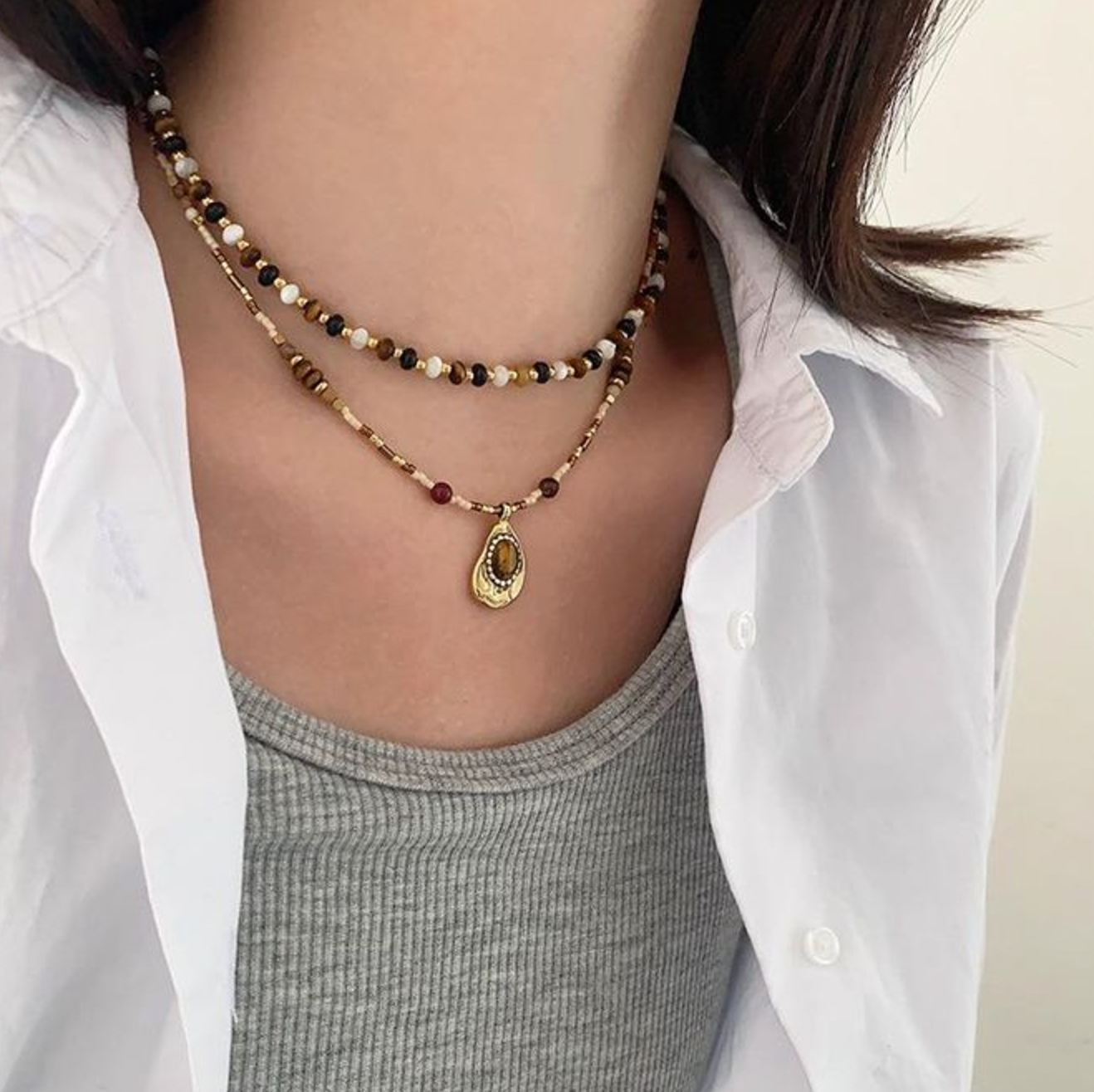 Boho stílusú nyaklánc apró, meleg barna és arany árnyalatú gyöngyökkel díszítve. Az arany keretes tigris szem imitációjú medál egyedi karaktert kölcsönöz ennek az ékszernek. Tökéletes a vintage és természetes anyagok kedvelőinek.