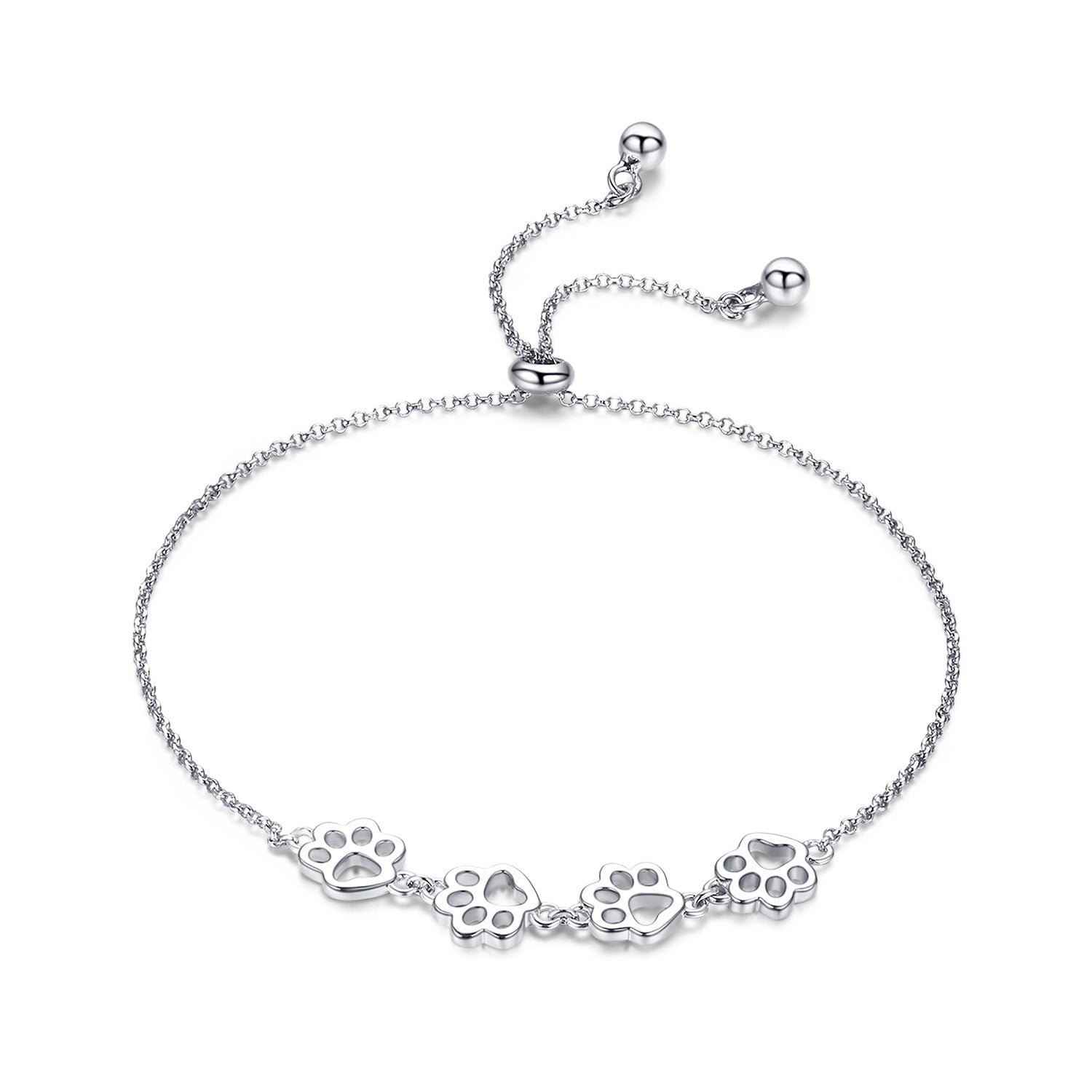 Ez az imádnivaló ezüst karkötő tökéletes szerelmi vallomás minden háziállat-kedvelő számára. A finom láncot négy részletesen kidolgozott mancs díszíti, amelyek a hűséget és a végtelen barátságot szimbolizálják. A praktikus csúszókapocsnak (bollo stílus) köszönhetően a karkötő minden csuklóhoz alkalmazkodik, és maximális viselési kényelmet biztosít. Ez egy kedves és stílusos kiegészítő, amely mindig emlékeztetni fogja Önt négylábú kedvenceire.