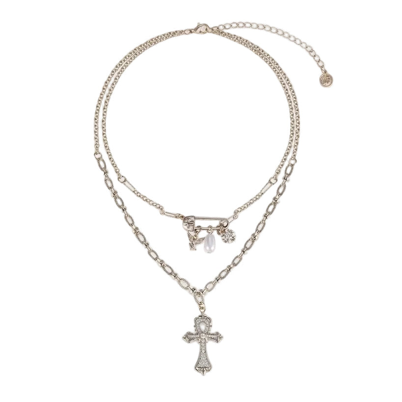 Ez a kétrétegű nyaklánc a történelmi szimbolika és a kortárs városi esztétika mesteri ötvözete. A rövidebb, finom choker stílusú réteg egy játékos, de "edgy" elemet hordoz egy biztonsági tű formájában, amelyen apró talizmánok függenek – egy finom gyöngy, egy csillag és egy kis kulcs. A hosszabb réteg, hangsúlyosabb láncszerkezettel, a domináns, gazdagon díszített egyiptomi Ankh keresztet viseli, amely sűrűn van beültetve csillogó kristályokkal. Ez a kontraszt a "safety pin" elem nyerssége és a kereszt szent eleganciája között olyan ékszert hoz létre, amely tökéletesen kiegészíti a grunge-glam és a modern Y2K esztétikát.