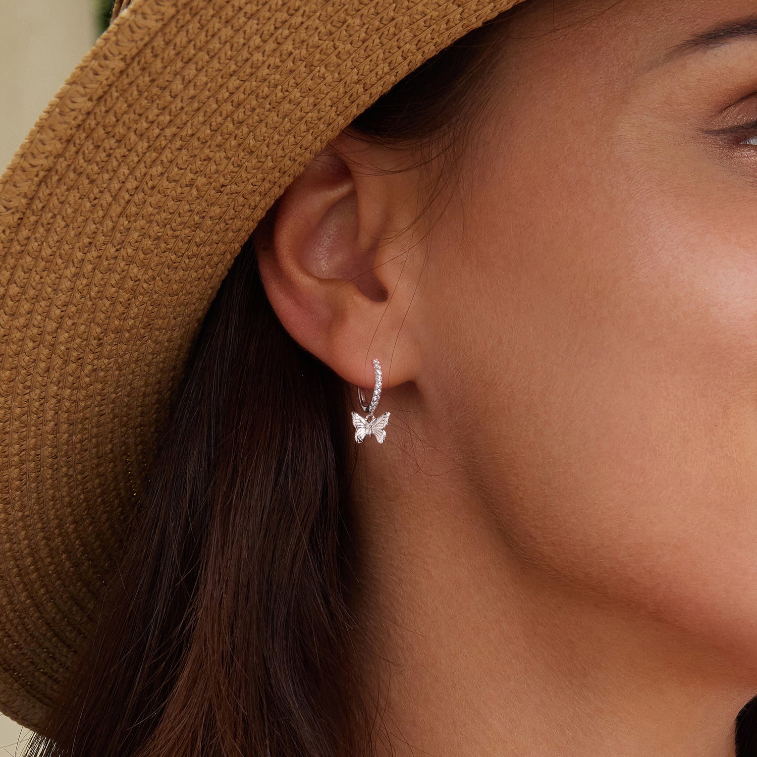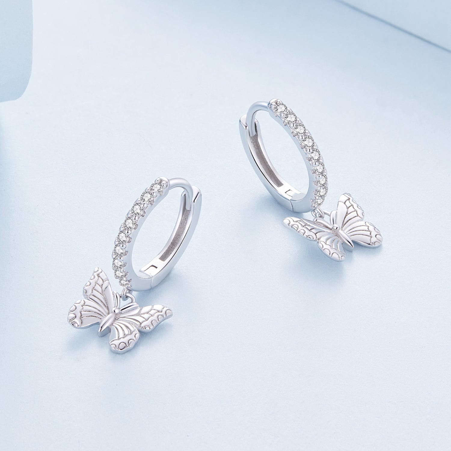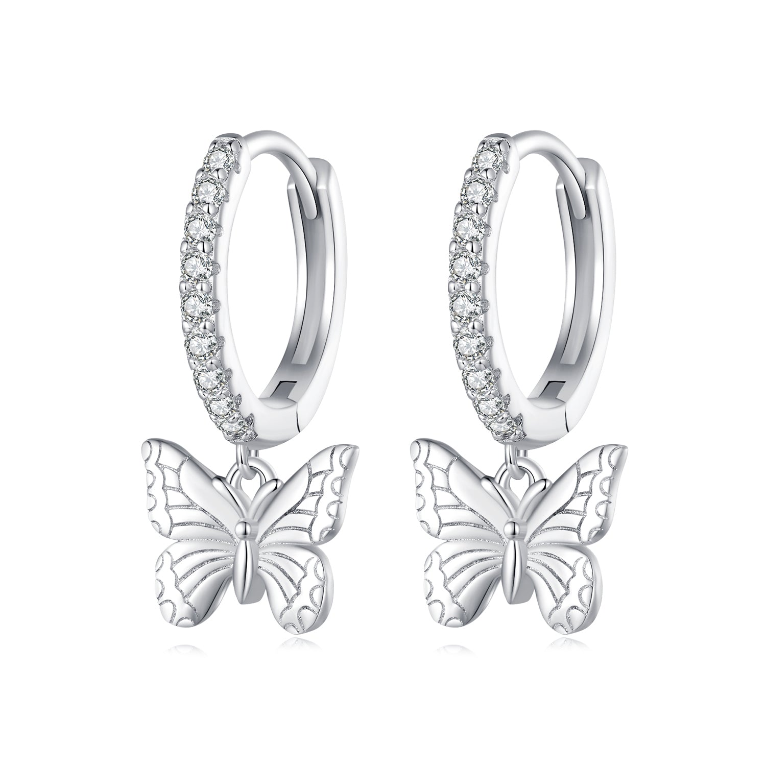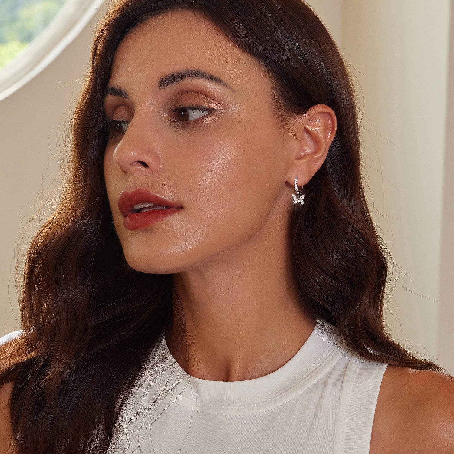 Ezek az elegáns lógós fülbevalók a természet finomságát és a modern, csillogó dizájnt ötvözik. A felső rész kisebb ezüst karikákból áll, amelyek elöl sűrűn kirakottak ragyogó, tiszta cirkóniákkal. A karikákon részletesen kidolgozott pillangó alakú medálok lógnak, melyek szárnyain finom gravírozás található, ami mélységet és realisztikus megjelenést kölcsönöz nekik. A fülbevalók nagyon nőiesek, és a biztonságos patentos záródásnak köszönhetően ideálisak mindennapi viseletre és különleges alkalmakra egyaránt. A pillangó szimbóluma a változást és a szabadságot képviseli, ami mélyebb jelentéssel bíró gyönyörű ajándékká teszi ezt az ékszert.