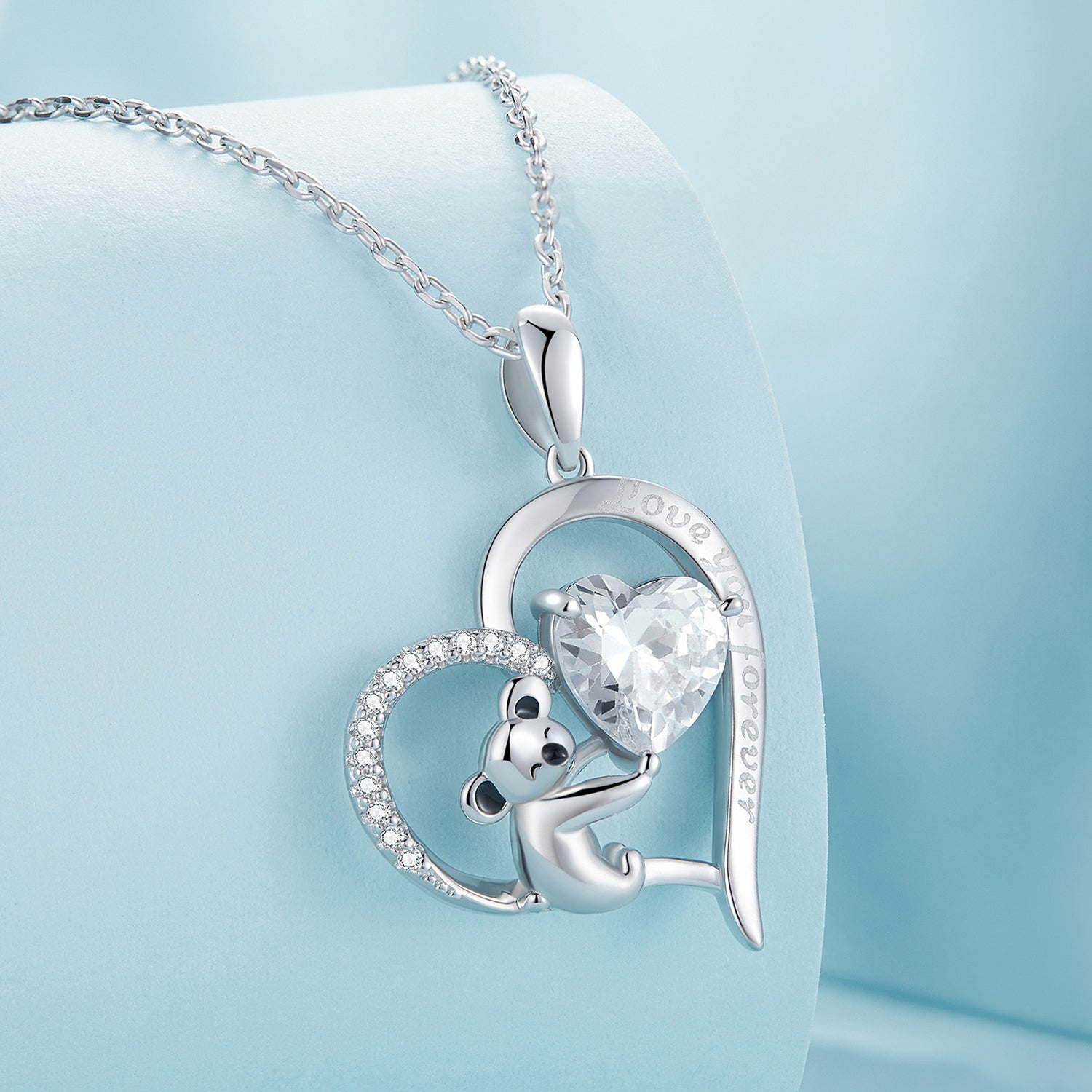 Ez az imádnivaló nyaklánc a gyengédség és a barátság ünnepe. A nyitott szív alakú medál egy részletesen kidolgozott ezüst koalát rejt, amely a mancsában egy nagy, átlátszó, szív alakú cirkóniát tart. A medál egyik vonalát sűrűn apró, csillogó cirkóniák díszítik, míg a másikon a "Love you forever" finom gravírozott felirat található. Ez az ékszer ideális ajándék egy szeretett személy számára, akinek végtelen szeretetét szeretné kifejezni.